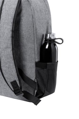 Two-tone, RPET backpack with zipped main compartment, padded laptop (15") and tablet (10") compartment, side pockets, padded back and shoulder straps. 600D RPET polyester.