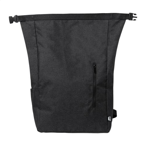 Waterproof, rolltop backpack in RPET with side pocket, zipped front pocket, padded back and shoulder straps. With distinctive RPET label. 300D RPET polyester.