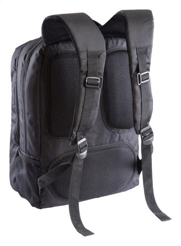 Backpack with multiple zipped compartments, ergonomic back, padded shoulder straps and laptop compartment (15"). 600D nylon.