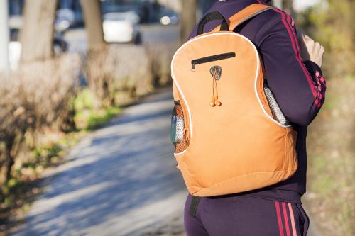 600D polyester backpack with adjustable shoulder straps. With earphone outlet, mesh side pockets, zipped mobile pocket and main compartment.