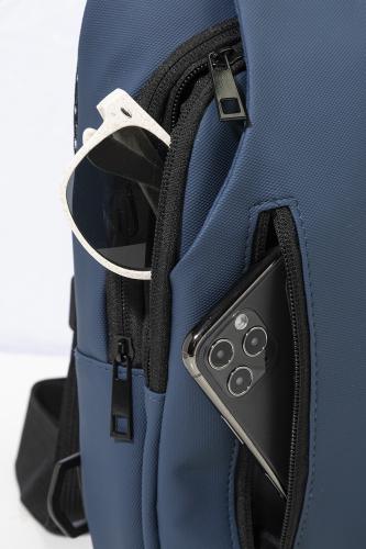 Waterproof RPET crossbody sling bag with zipped pockets, buckle closure and padded back. With adjustable shoulder strap featuring left and right side positions. PU coated 600D RPET polyester, with distinctive RPET label.