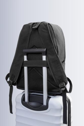 Recycled canvas backpack with zipped main compartment, padded laptop (15") compartment, 2 zipped front pocket, side pockets, trolley strap, padded back and shoulder straps. 70% recycled cotton and 30% RPET polyester. With distinctive recycled cotton label.