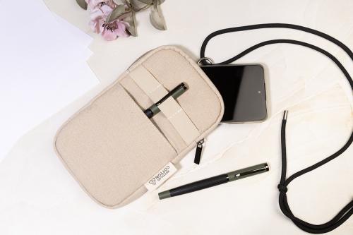 Recycled canvas crossbody mobile phone bag with zipped main compartment, front pocket and adjustable RPET polyester lanyard. 70% recycled cotton and 30% RPET polyester. With distinctive recycled cotton label.