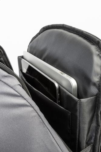 RPET anti-theft backpack with zipped compartment, padded laptop (15") and tablet (12") compartment, trolley strap, padded back and shoulder straps. With hidden anti-theft pocket. 300D RPET polyester. With distinctive RPET label.