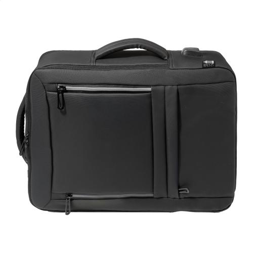 Waterproof, RPET extendable backpack and document bag with zipped main compartment, front pockets with reflective zippers, padded laptop (15") and tablet (12") compartment, and built-in USB port for power banks. With trolley strap, padded back and shoulder straps with chest strap. PU coated 600D RPET polyester, with distinctive RPET label.