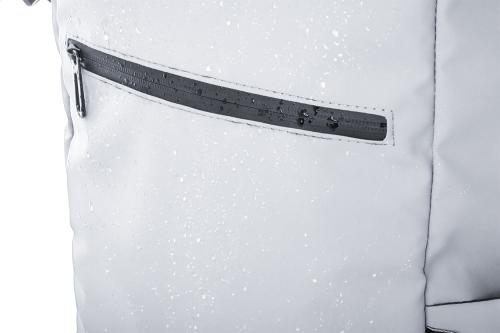 Waterproof, rolltop backpack in RPET with buckle and velcro closure, padded laptop (16") and tablet (10") compartment, zipped front pocket, side pockets, padded back and shoulder straps. PU coated 600D RPET polyester, with distinctive RPET label.