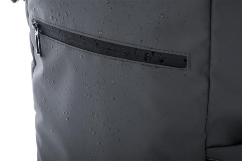 Waterproof, rolltop backpack in RPET with buckle and velcro closure, padded laptop (16") and tablet (10") compartment, zipped front pocket, side pockets, padded back and shoulder straps. PU coated 600D RPET polyester, with distinctive RPET label.
