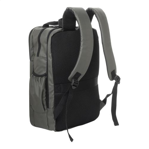 Waterproof RPET backpack with 2 zipped compartments, 2 zipped front pockets, side pockets and padded laptop (16") compartment. With trolley strap, padded back and shoulder straps. PU coated 600D RPET polyester, with distinctive RPET label.