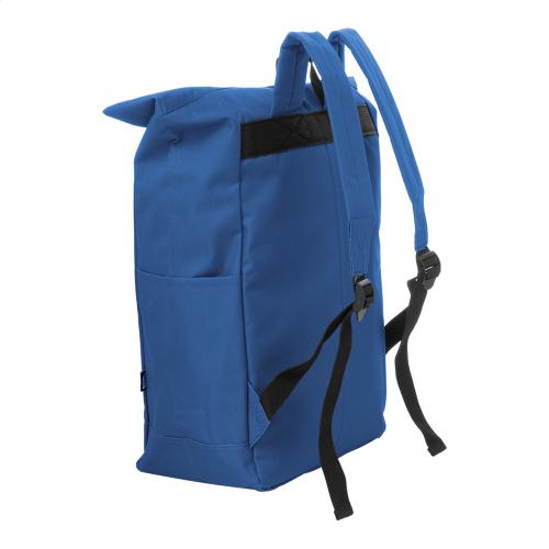 RPET rolltop backpack with buckle closure, laptop (14") compartment and zipped front pocket. With padded back and shoulder straps. 600D RPET polyester with distinctive RPET label.