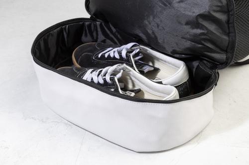 Premium RPET drawstring bag with zipped shoe compartment, mesh side inlays and wide straps. PU coated 600D RPET polyester with distinctive RPET label.