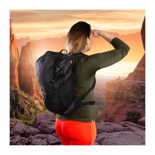 Practical Schwarzwolf backpack which is suitable for hiking as well as city use. The backpack has a main compartment with a zipper and an inner pocket, 2 side mesh pockets, a small zipper pocket in the upper back and a waist belt. There are two pull straps with a buckles on both sides of the backpack. It has a padded back system and shoulder straps.