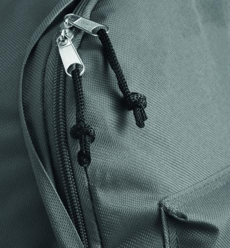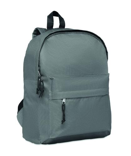 Backpack in 600D polyester with outside pocket with zipper.