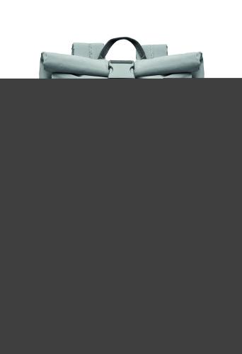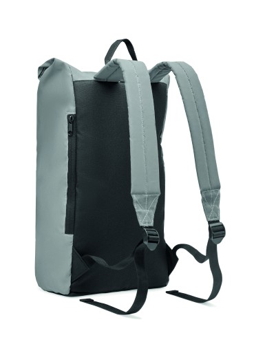 15 inch laptop rolltop backpack in high reflective 190T polyester. Additional internal side with hook and loop closure. Padded back, straps and bottom. Front sided zippered pocket. Bottom part in 600D recycled polyester.