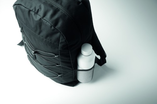 Backpack in 600D RPET polyester with decorating cord and front zippered pocket panel. Mesh pockets on both sides.
