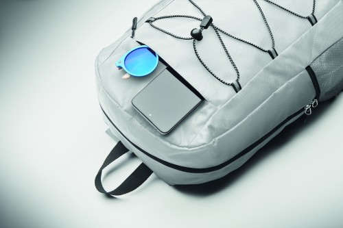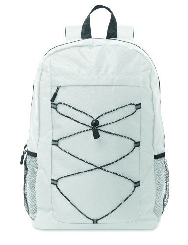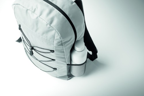 Backpack in 600D RPET polyester with decorating cord and front zippered pocket panel. Mesh pockets on both sides.