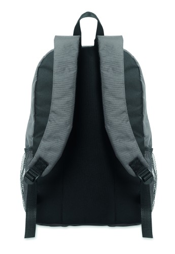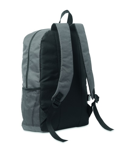 Backpack in 600D RPET polyester with decorating cord and front zippered pocket panel. Mesh pockets on both sides.