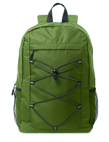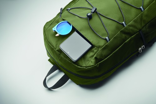 Backpack in 600D RPET polyester with decorating cord and front zippered pocket panel. Mesh pockets on both sides.