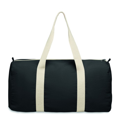 Duffle, sports or travel bag with zippered side compartment and zippered inner pocket in 320 gr/m² recycled cotton (80%) and recycled polyester (20%) with long handles.