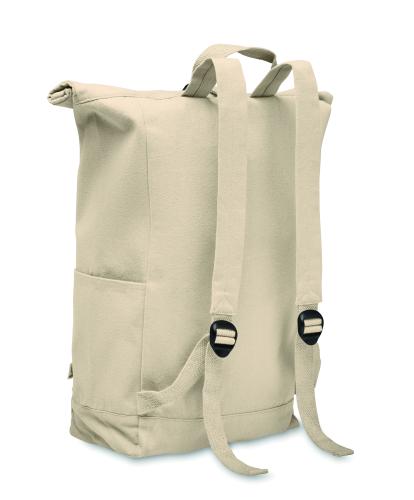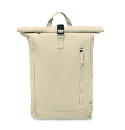 Roll top backpack with hook and loop closure in 390 gr/m² recycled cotton (80%) and recycled polyester (20%). Zippered front pocket.