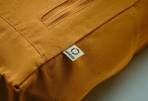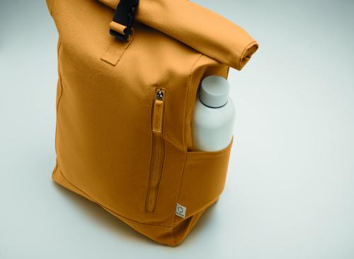 Roll top backpack with hook and loop closure in 390 gr/m² recycled cotton (80%) and recycled polyester (20%). Zippered front pocket.