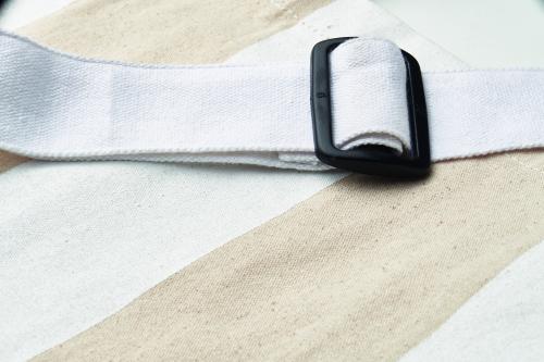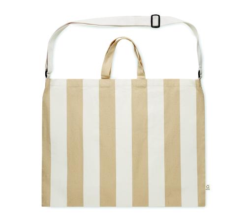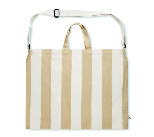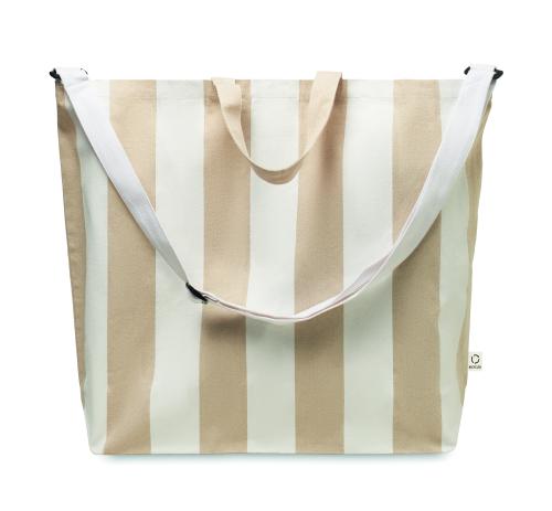 Extra large striped beach bag in 280 gr/m² recycled cotton (80%) and recycled polyester (20%) with inner pocket. Short handles and one large adjustable shoulder strap.