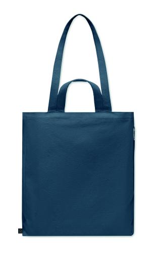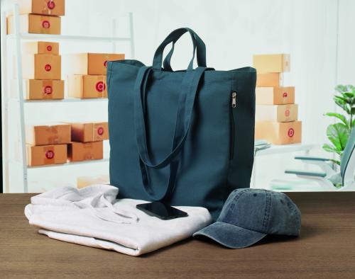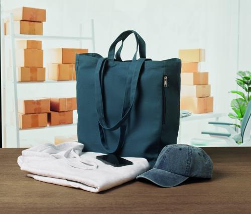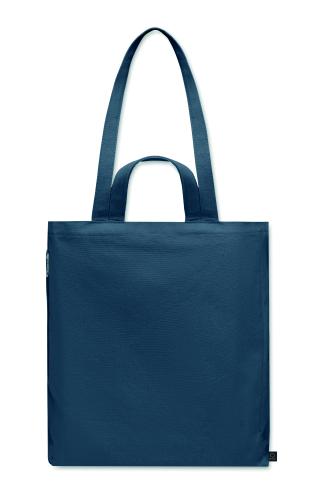 Recycled polycotton shopping or beach bag (70% recycled cotton, 30% recycled polyester) with short and long handles. It has a side zippered pocket. 380 gr/m².