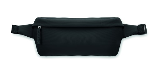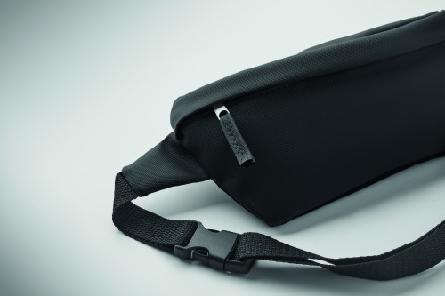 Waist bag with PU coated 600D RPET polyester, 210D RPET polyester lining and front zippered pocket.