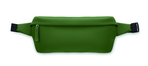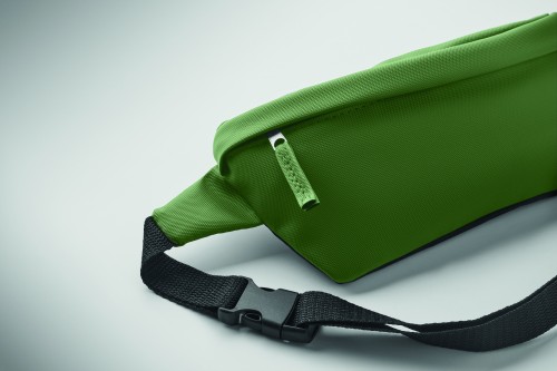 Waist bag with PU coated 600D RPET polyester, 210D RPET polyester lining and front zippered pocket.