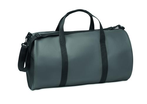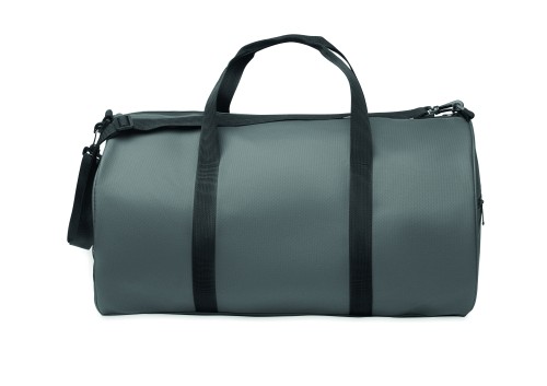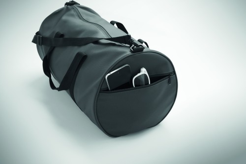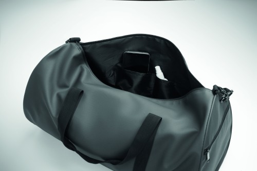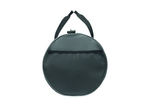 Duffle bag in 600D RPET polyester with PU coating. Front zippered pocket. Inside 210D RPET polyester lining. 1 side zippered compartment / 1 side mesh compartment. Zippered pocket inside.