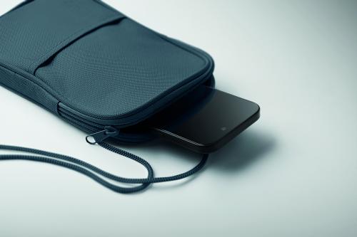 Cross body travel pouch in 600D RPET polyester and 210D RPET lining with cord strap.