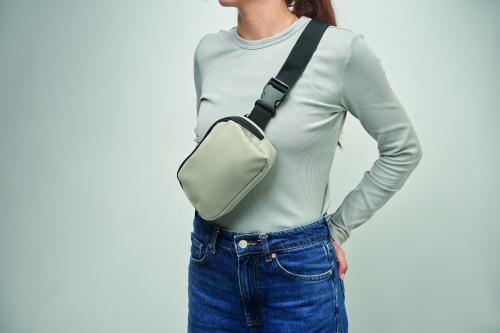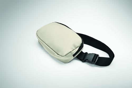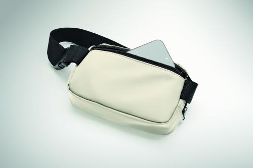 Waist bag or cross body bag in soft PU with 210D RPET polyester lining. 1 main zippered pocket, 1 back zippered pocket and mesh inside compartment.