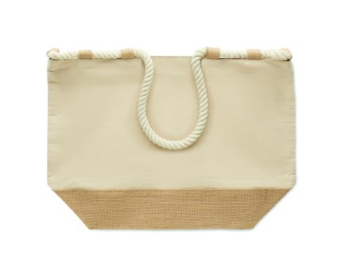 Beach bag in 280 gr/m² cotton canvas and jute with cord handles. Features zipper closure, jute-covered bottom and 10 jute loops.