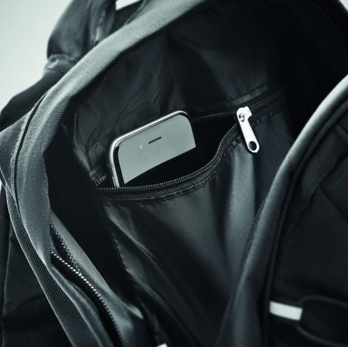 Backpack in 600D RPET with dark cords in front and reflective front panel feature. Mesh pockets on both sides.