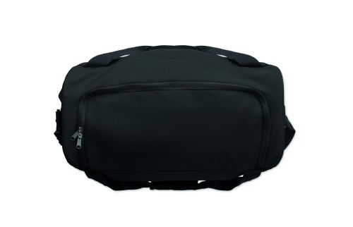 Sport or travelling bag in 600D RPET with large zippered front pocket, inside zippered pocket and adjustable and detachable shoulder strap.