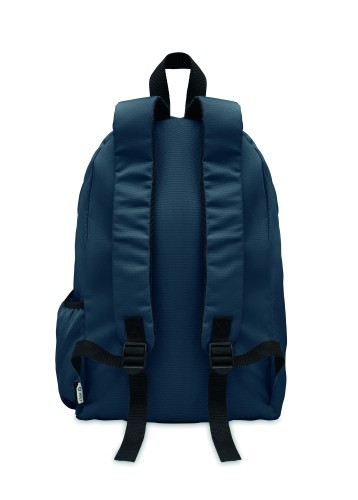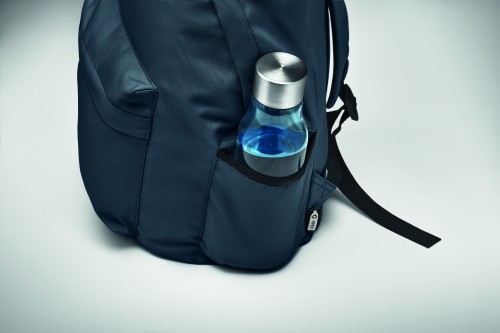 Backpack in 600D RPET polyester with outside pocket with zipper. Padded back and has a side bottle compartment.