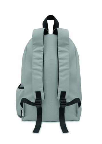 Backpack in 600D RPET polyester with outside pocket with zipper. Padded back and has a side bottle compartment.