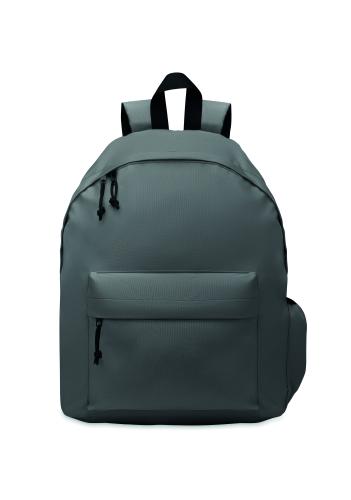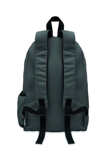 Backpack in 600D RPET polyester with outside pocket with zipper. Padded back and has a side bottle compartment.
