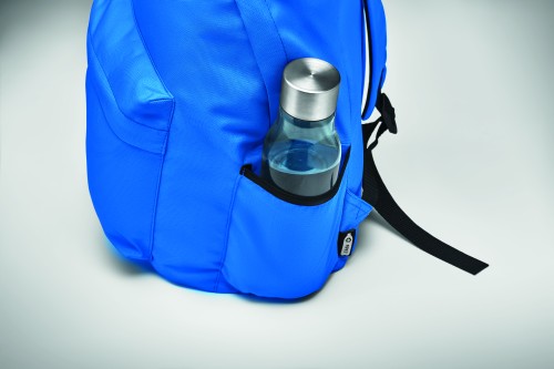 Backpack in 600D RPET polyester with outside pocket with zipper. Padded back and has a side bottle compartment.