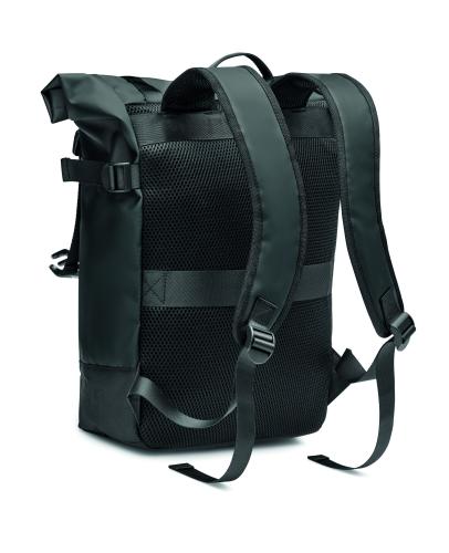 Rolltop backpack in 50C tarpaulin with padded back, base and shoulder straps reinforcement. Front zippered pockets.