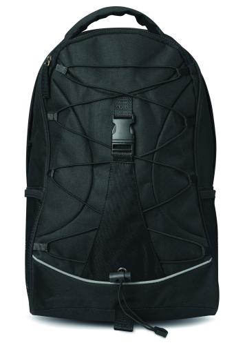 Backpack in 600D polyester with colourful contrasting facing and decorating cord on the front panel. Mesh pockets on both sides.