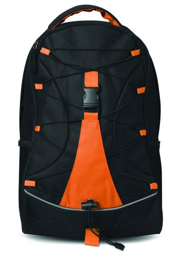 Backpack in 600D polyester with colourful contrasting facing and decorating cord on the front panel. Mesh pockets on both sides.