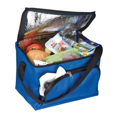 210D polyester cooler bag with a zipper front compartment and nylon carrying straps. Suitable for 6 cans with 0.5l each, small bottles or anything that needs to stay fresh.