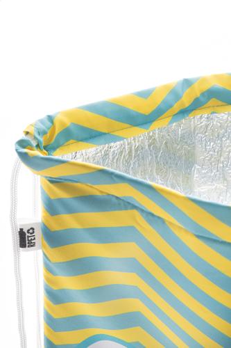 Custom made, drawstring cooler bag in 600D RPET polyester with aluminium padding. With all over sublimation printed graphics and distinctive RPET label. MOQ: 25 pcs.