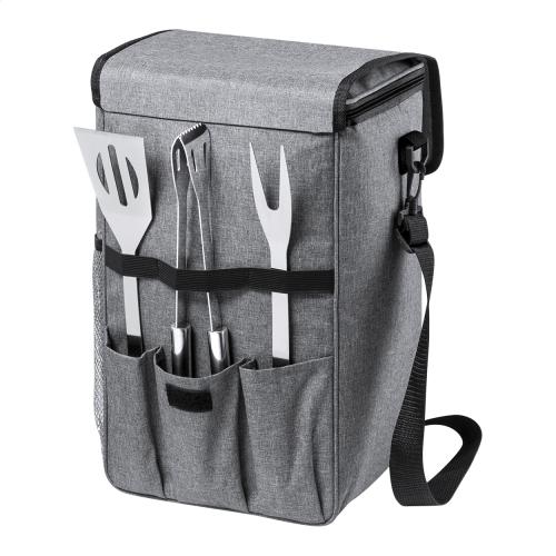 RPET cooler bag with PEVA padding, zipped compartment and adjustable shoulder strap. Including 3 pc stainless steel barbecue set (fork, shovel and clip). 600D RPET polyester with distinctive RPET label.
