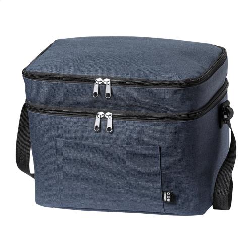 600D RPET polyester cooler bag with PEVA padding, with 2 zipped compartment and adjustable shoulder strap. With distinctive RPET label.
