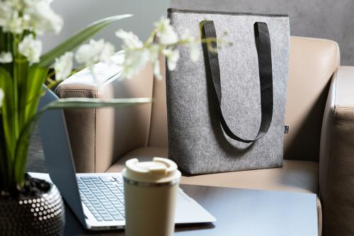Cooler shopping bag in RPET felt with aluminium padding. With velcro closure, zipped front pocket and long handles. With distinctive RPET label.