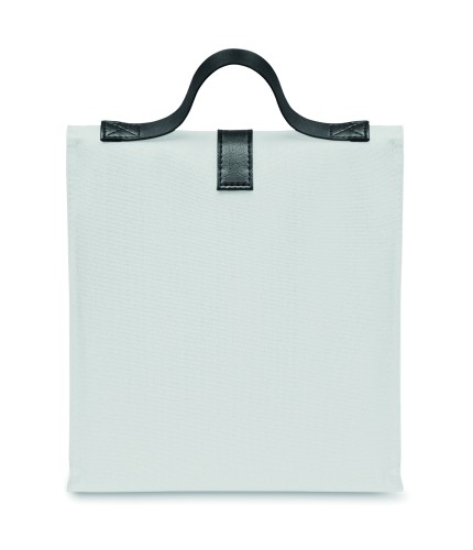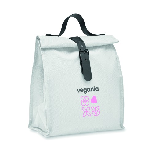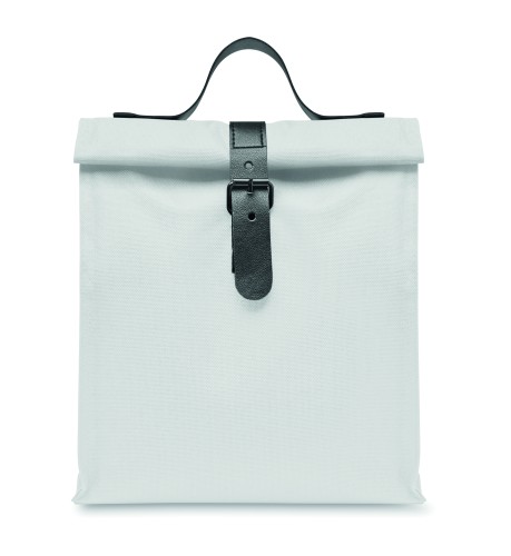 600D RPET polyester insulated roll top lunch cooler bag with PU handle and closure. Insulation: 3mm PE foam with PEVA.