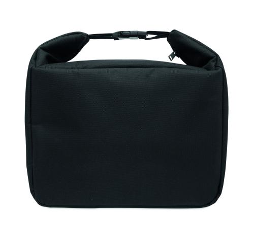 Cooler lunch bag with internal temperature indicator made of 600D RPET with 3mm PE foam with aluminium foil lining. Buckle closure. Zippered main compartment. With side zippered pocket. Capacity: 5 L
