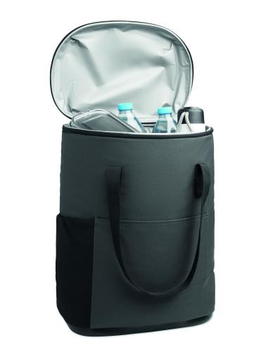 Cooler rucksack made of water-repellent 600D RPET with PE foam insulation and PEVA lining. Features moulded lid, padded mesh back, front zip pocket, and side sandwich mesh pockets. Capacity 20L.