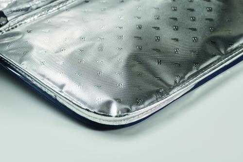 Picnic cooler bag in 600D RPET polyester for 2 people with zippered front pocket including stainless steel cutlery, 2 plates in PS, 2 glasses in PS and 2 cotton napkins. Capacity: 18l
